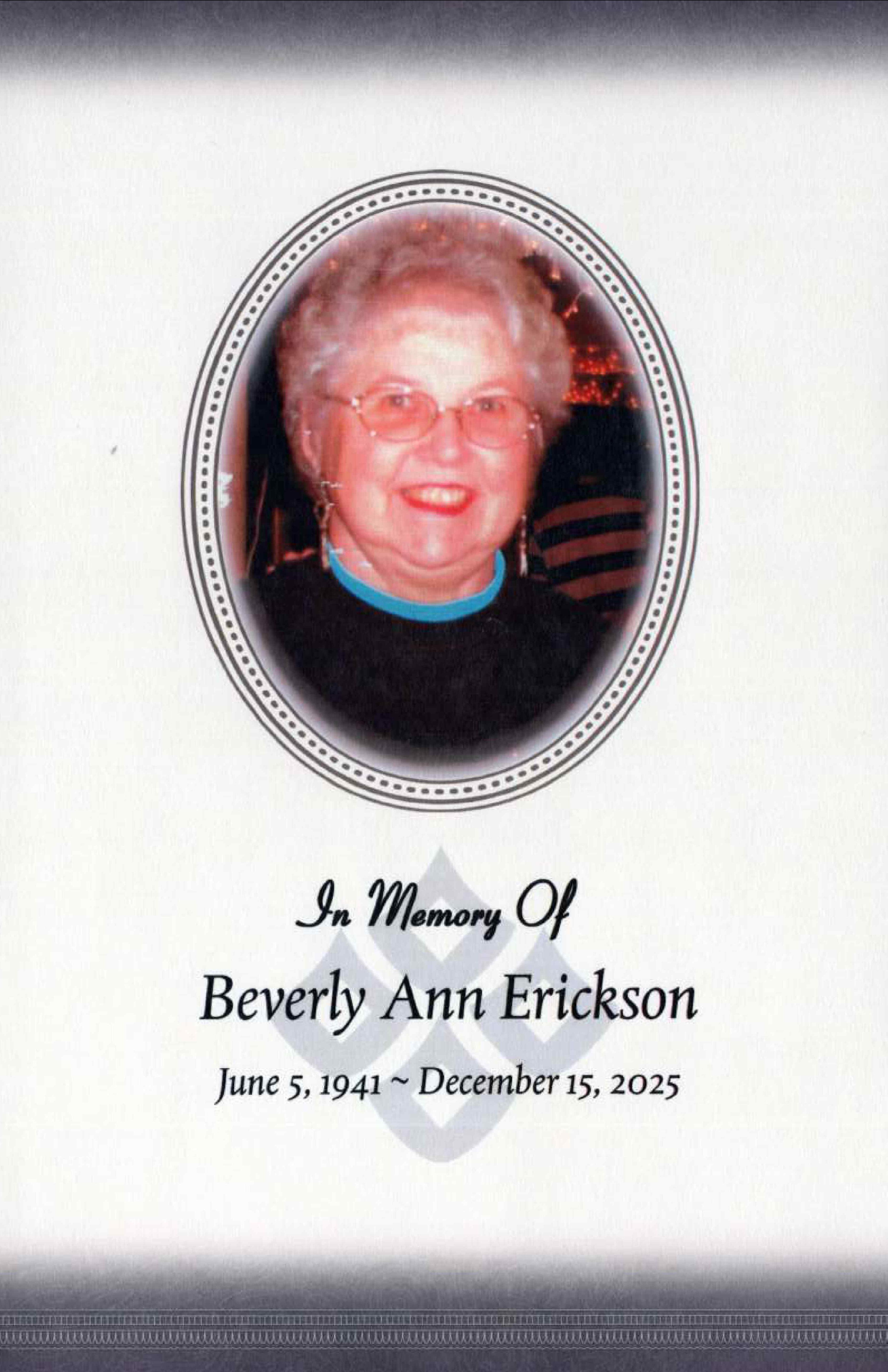 Beverly Erickson, age 84, of Wheaton, Minnesota, passed away on December 15, 2025 at St. Gerard's Community Nursing Home in Hankinson, North Dakota.